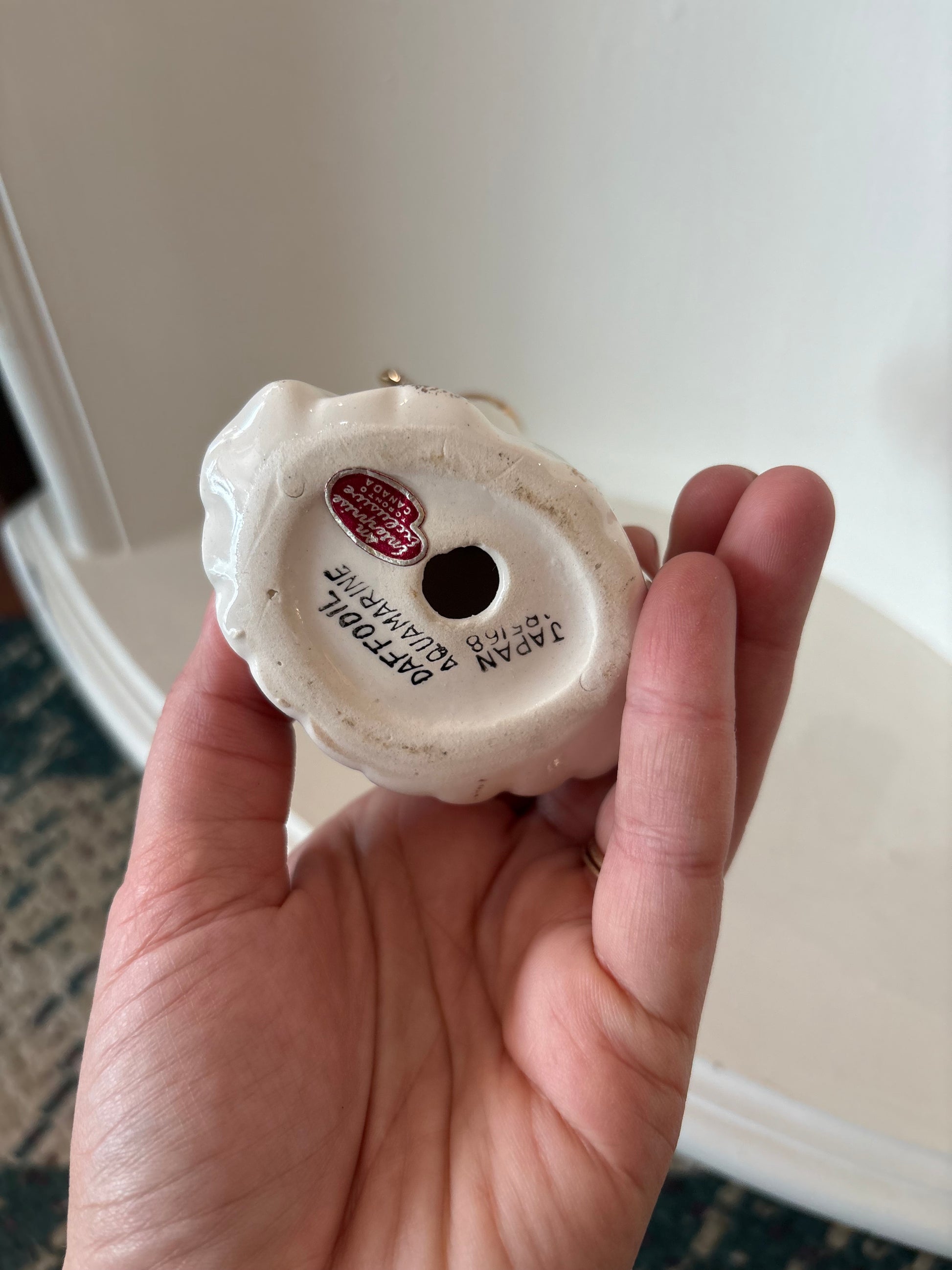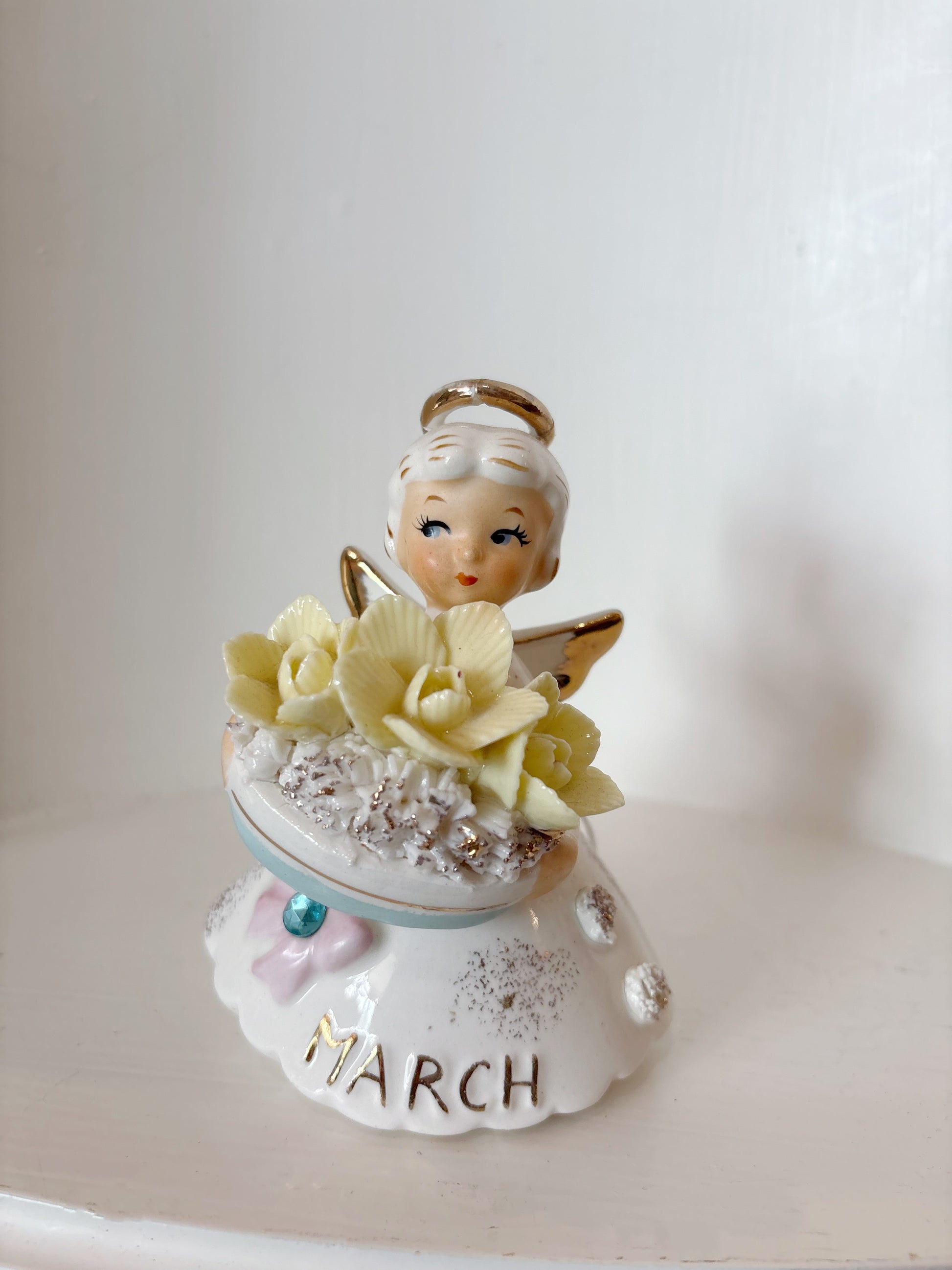 Vintage Lefton March Birthday Girl Angel Daffodil Aquamarine Spaghetti Figurine